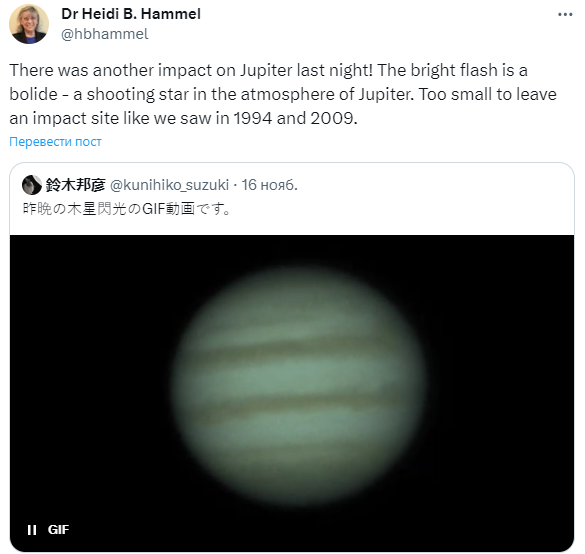 "Минувшей ночью произошло еще одно столкновение с Юпитером! Яркая вспышка — это болид — падающая звезда в атмосфере Юпитера. Слишком мала, чтобы оставить место столкновения, как мы видели в 1994 и 2009 годах", — отметила сотрудница лаборатории космического телескопа NASA "Джеймс Уэбб".